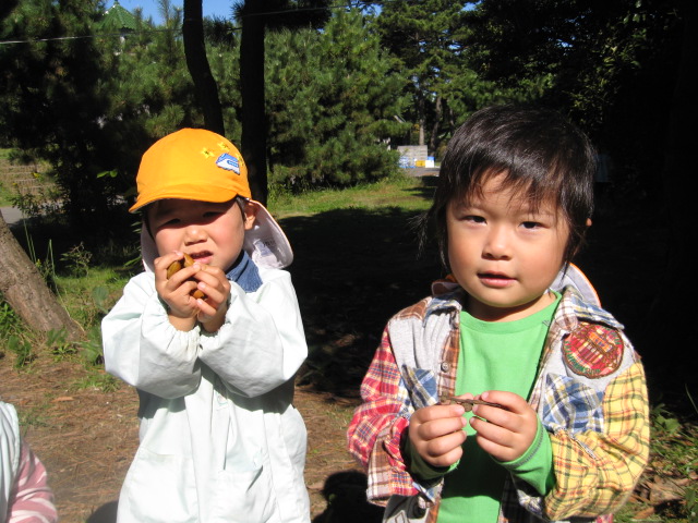 お外は、ポカポカお天気でよいお散歩日和になりました。今日はコースを変えて、前原住宅の先のほうまで行ってきました。松ぼっくりを拾ったり、黄色い蝶々やいろいろな色のお花を見つけて、(お花)