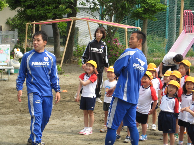 本年度も、NPO法人ヴェレン大洗の大山壮朗監督、三浦強生コーチをお迎えしてサッカー教室が始まりました。今日を楽しみにしていたので、ちょっとテンション、上がり気味でしたが後半のゲームまで真剣な顔で指導を受けていました。次の教室まで、園でもPM、サッカーの時間を作って、サッカーボールやゴールに慣れることから始めていきたいと思っています。