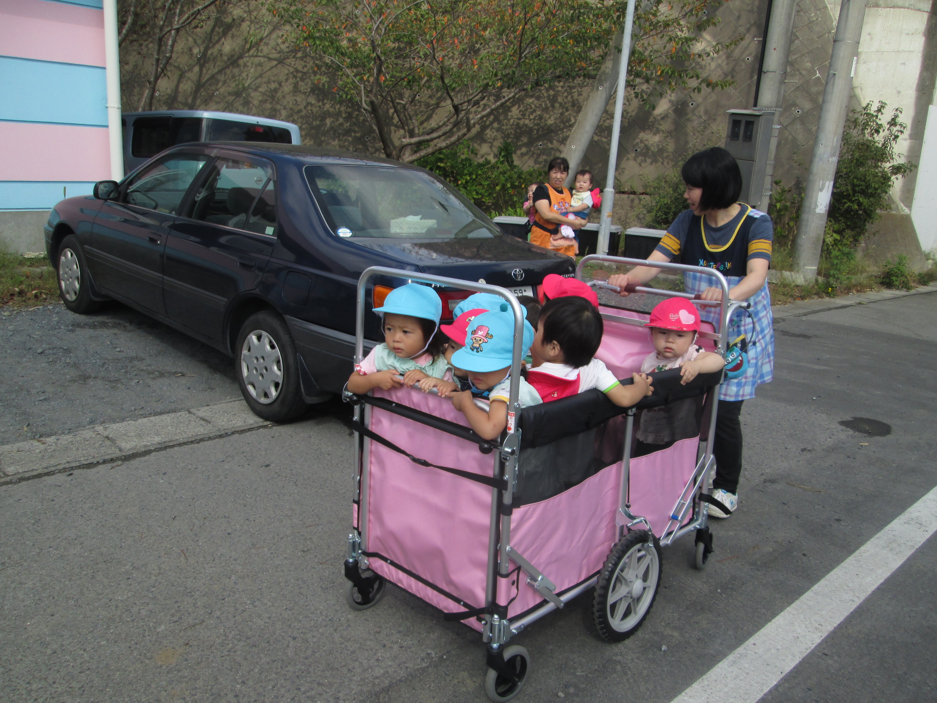 泣いてしまった子もいましたが、散歩へ行くと泣き止み外の景色を見て楽しそうな子供たちです。